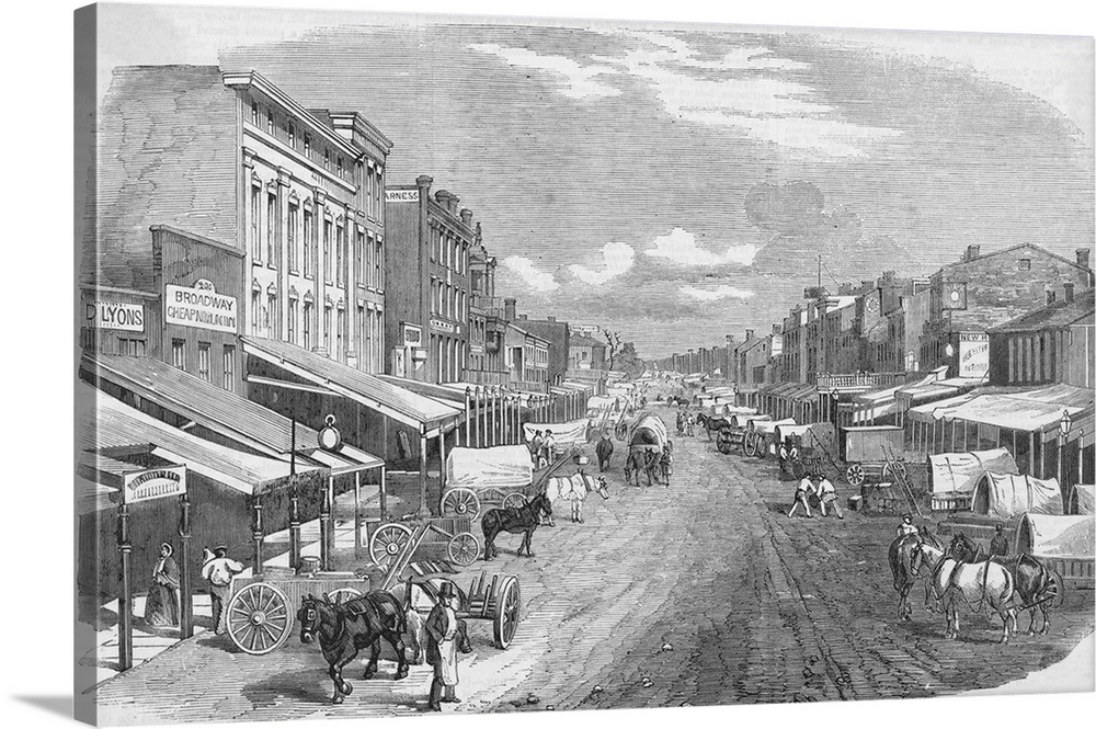 So here you have an engraving from 1858 of Main Street in St. Louis, with its nice masonry…and horse-drawn wagons and dirt-covered street…