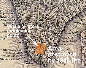It was said to have started in a whale-oil and candle-manufacturing establishment, and quickly spread to other wooden structures in Lower Manhattan.