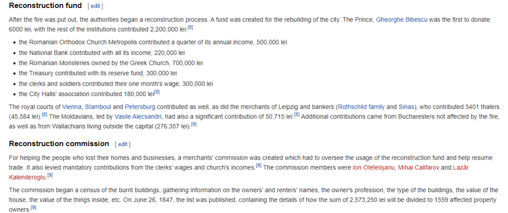 A reconstruction fund was said to have been started after the fire was put out, with contributions from the Prince of Wallachia; banks; churches; monasteries; the Treasury; clerks and soldiers; the City Halls’ Association; and outside contributors. A reconstruction commission was formed, and so on and so forth.