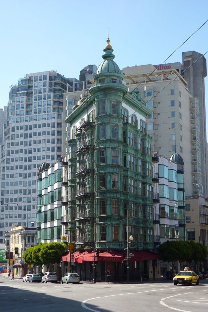 This is the Columbus Tower, also known as the Sentinel Building, on Kearny Street, with its copper and white-tile exterior. Construction of it was said to have been begun before the 1906 fire, which it purportedly survived.