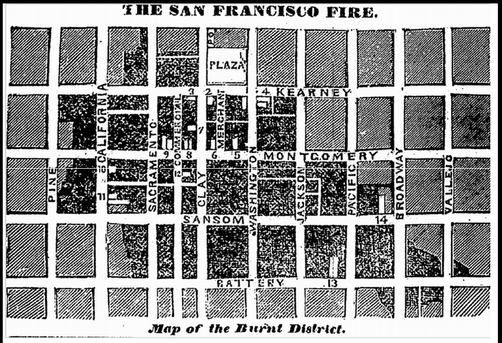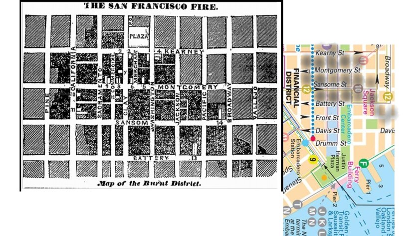 Here is the map of the Burnt District of the 1851 San Francisco Fire and a map of its exact location in the city today.