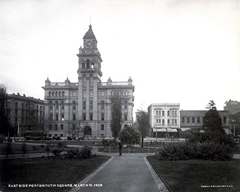 Here is an historic photo of the First Kearny Street Hall of Justice, a jail that was called a book and intake facility, and said to have been built in 1912; rehabilitated by FDR’s New Deal’s Works Project Administration in the 1930s; and then demolished in 1968.