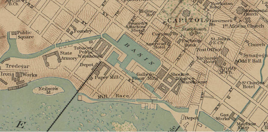 Here is another view of Richmond and its State Capitol Building in the middle of the picture, as seen from above the Canal Basin after the 1865 fire.