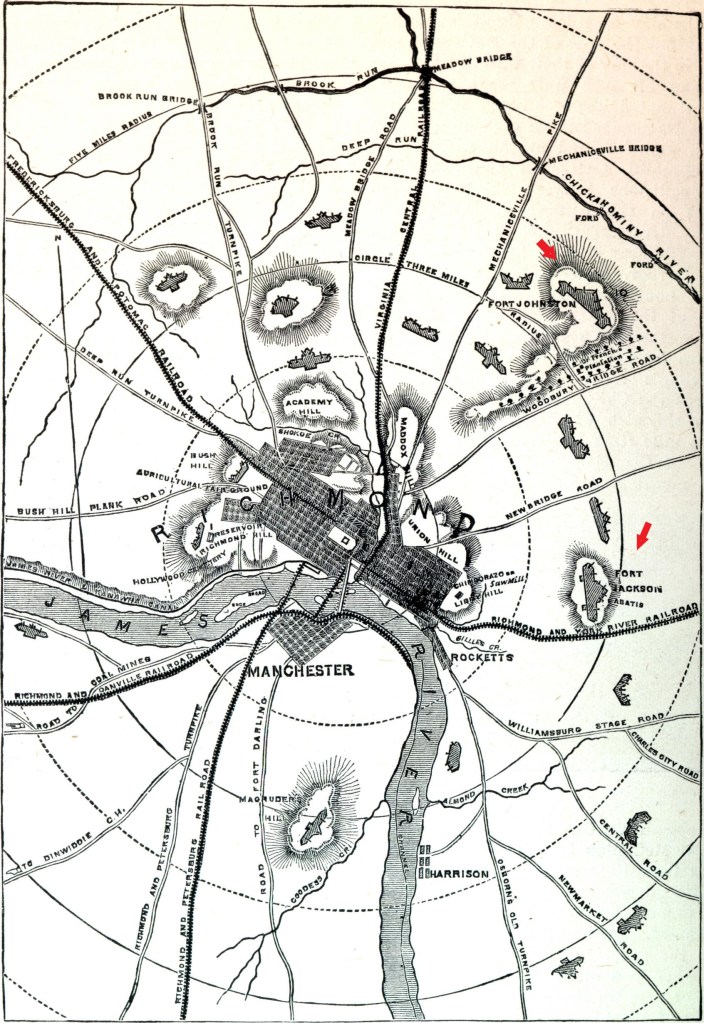 It looks like there were two named star forts on this map of Richmond and the surrounding areas – Fort Johnston and Fort Jackson – and possibly many more that don’t have names that are depicted as various shapes in the landscape.