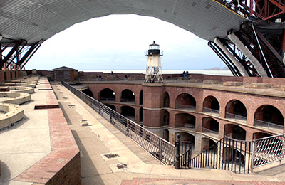 This is what it looks like inside the structure at Fort Point underneath this end of the Golden Gate Bridge, including a lighthouse…