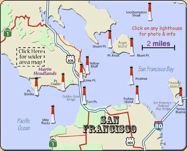 Another thing to point out is the location of this lighthouse and Alcatraz with respect to the Golden Gate bridge, and the two lighthouses on either end of the bridge.