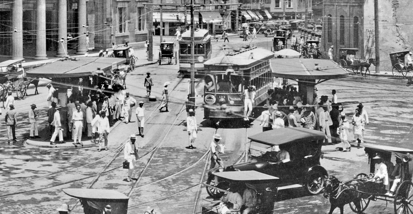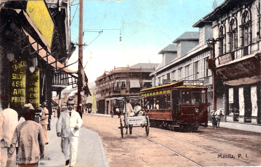 There was a streetcar system in Manila, called the Tranvias, construction of which was said to have been started in 1878, with the first line opening in 1882. This postcard was circa 1900, showing the contrast of the electric streetcar with the horse-drawn carriages.