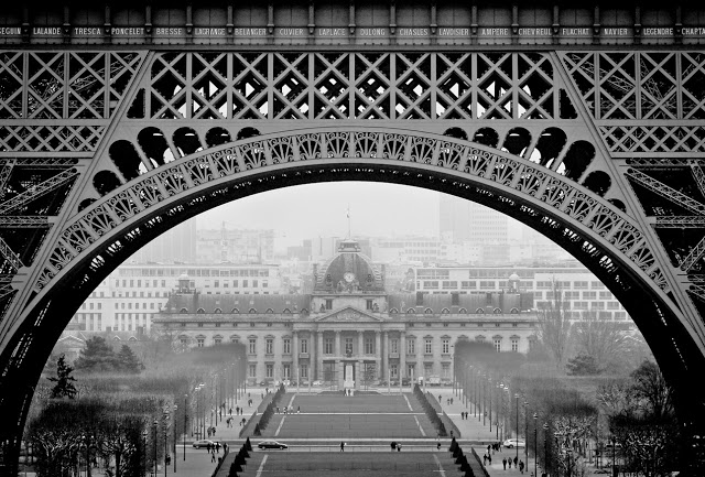 …the Ecole Militaire seen through the arch of the Eiffel Tower in Paris…