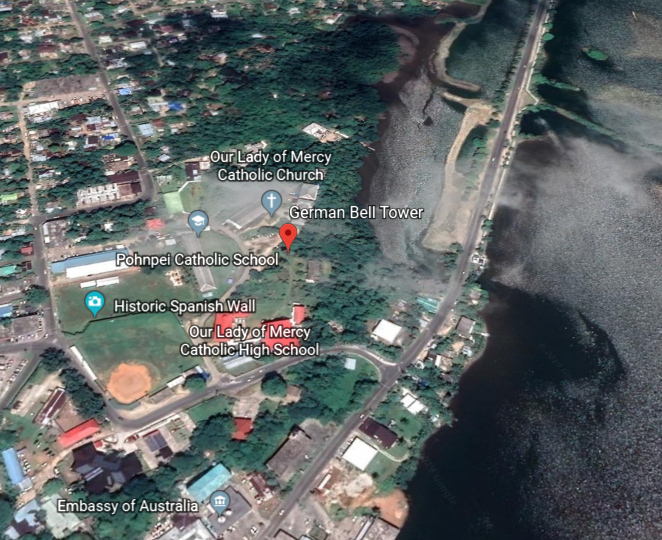 Interestingly, this is a photo from Google Earth, where you have the Spanish Wall, German Bell Tower, Pohnpei Catholic High School, Our Lady of Mercy Catholic High School, what looks like a baseball field right next to the high school, and the Embassy of Australia all pretty much in the same place…
