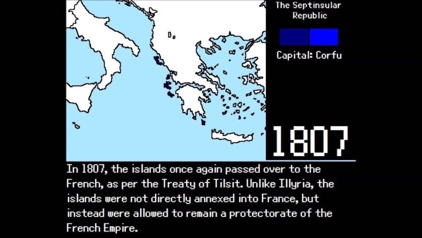 Then in 1807, Napoleon signed two agreements in the town of Tilsit in what was Prussia in East Germany, one between Emperor Alexander I of Russia, and the second treaty was signed with Prussia, and the Ionian Islands were returned to France, becoming a French Protectorate.