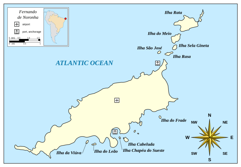 Fernando de Noronha, the name of the main island and its archipelago, is off the coast of Brazil near the city of Natal.