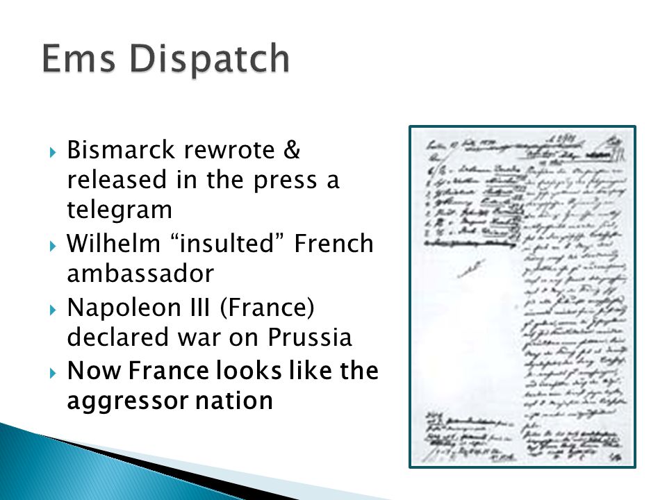 It was said that the German Chancellor Otto von Bismarck manipulated the situation by dispatching the Ems Telegram on July 14th of 1870, inciting the Second French Empire to declare war on the Kingdom of Prussia on July 19th of 1870.