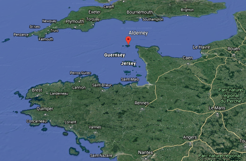 I used this Google Earth screenshot to orient myself to Alderney’s location with respect to England and France…