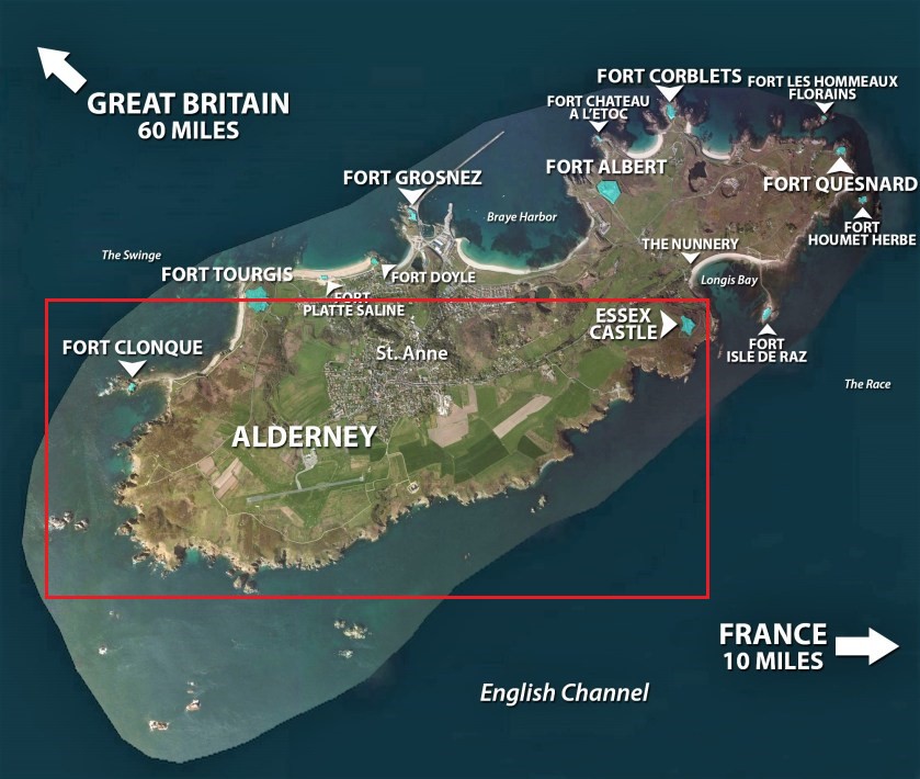 I have been intrigued by the Channel Islands since I saw this map of Alderney Island and all of the “forts” on this little island, which is 3-miles, or 5-kilometers, long, and 1 1/2-miles, or 2.4-kilometers, long.