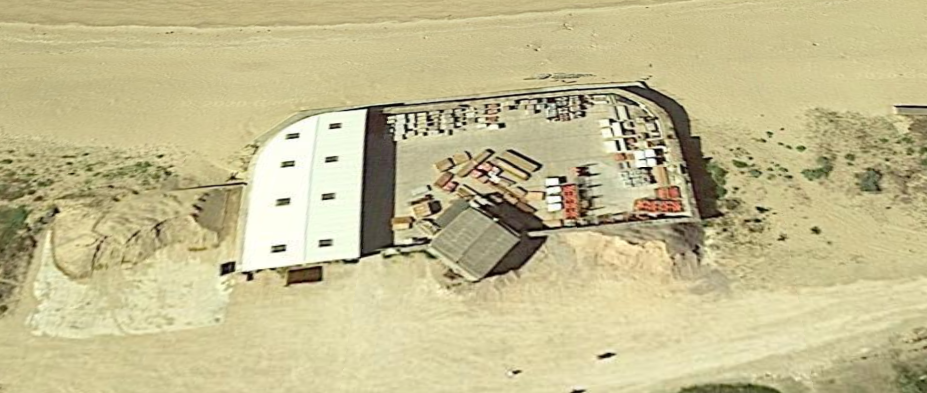 This is a close-up on Google Earth of the lone structure on the Platte Saline beach, and it could have been the star fort at one time, but it looks like it has been re-purposed into something like a storage or parking area.