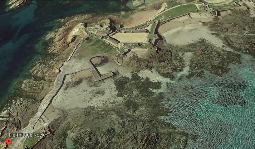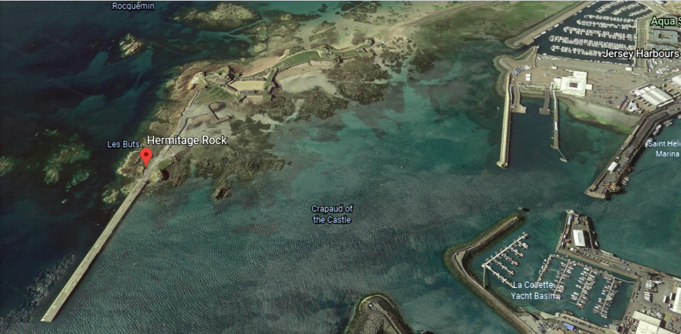 I found this photo in reference to a rocky beach in the Royal Bay of Grouville, saying that it is under water, as well as the Tower, at high tide.