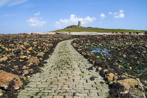 …and is connected to Guernseys L’Eree headland by a stone causeway at low tide.