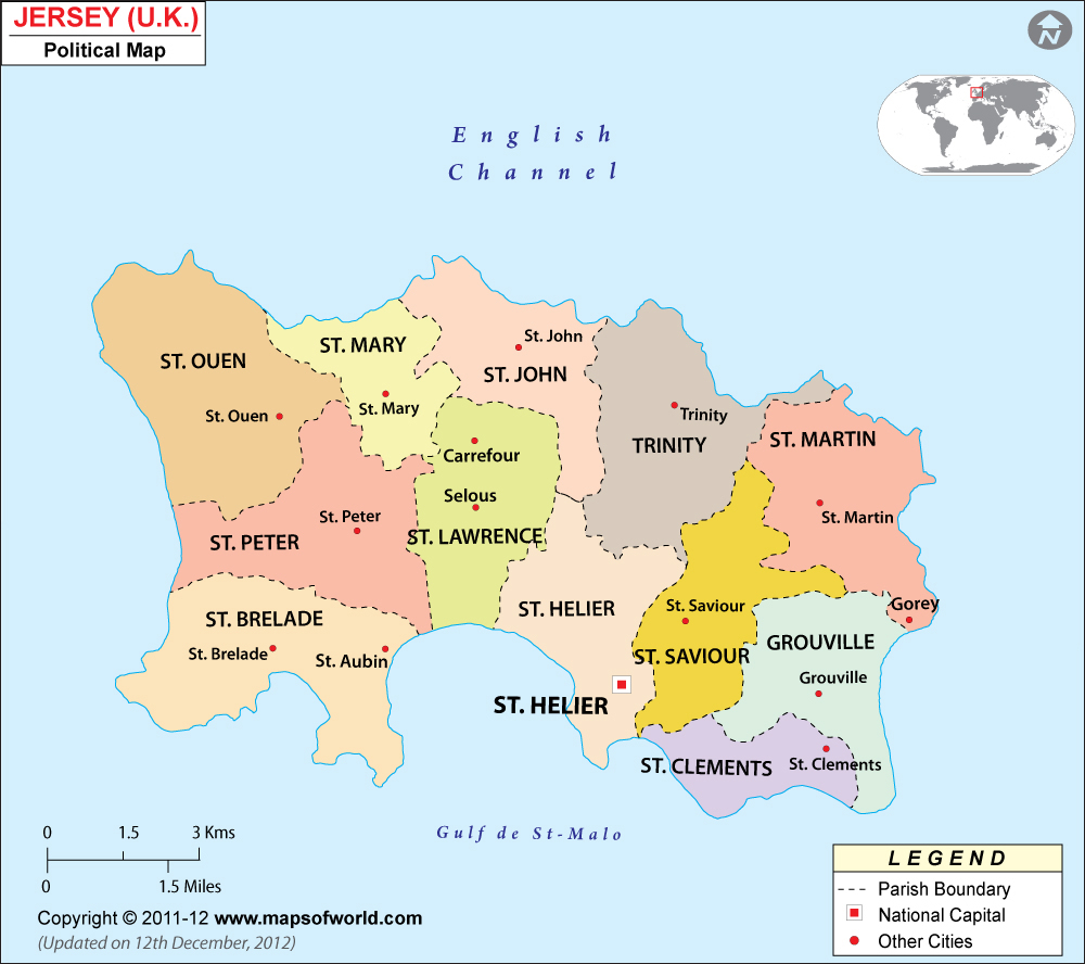 The city of St. Helier is the capital of Jersey, and the name of one of the 12 parishes of Jersey.