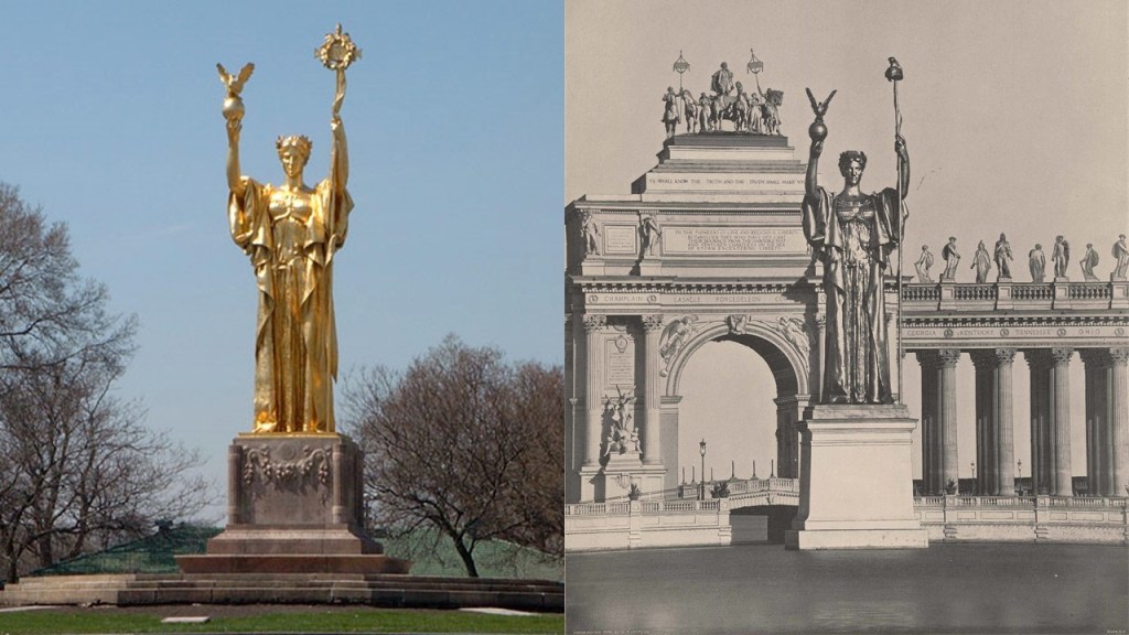 The original statue of the Exhibition was said to have been destroyed by fire, and the new statue sculpted by the same artist, and erected in 1918 to commemorate both the 25th-anniversary of the World’s Columbian Exposition and the centennial-anniversary of the statehood of Illinois.
