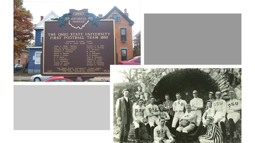 And in 1890, the first American football team was fielded by Ohio State University, with a photo of the team standing in front of an old stone archway.