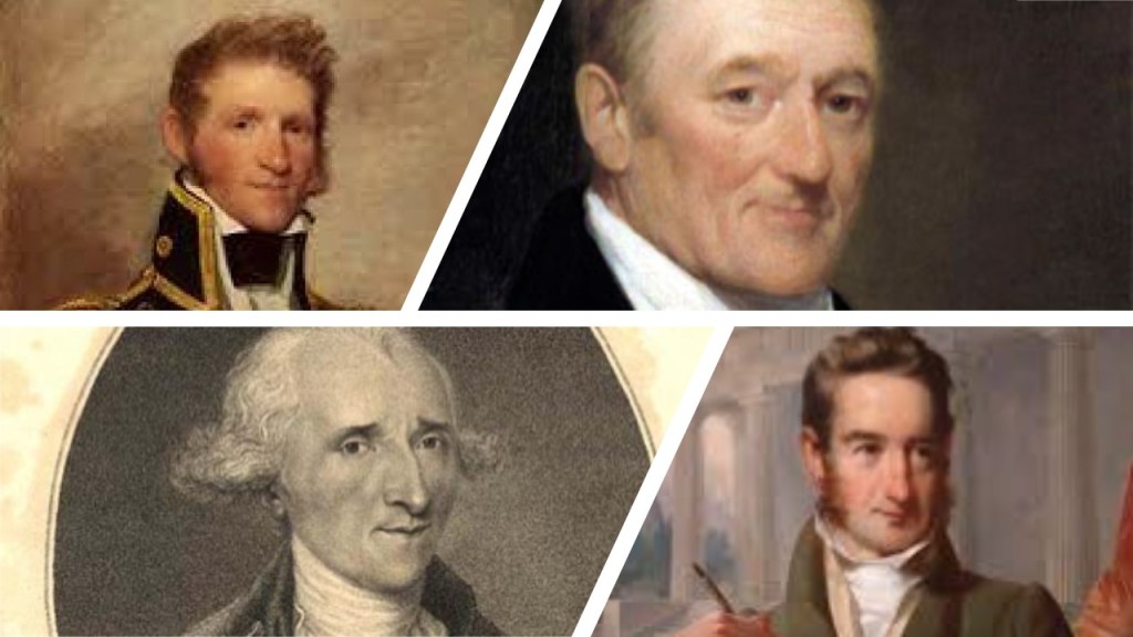 On the top left is Thomas Gilbert, captain of the British East India Company’s East Indiaman vessel Charlotte for whom the Gilbert Islands were named; on the top right, Canadian entrepreneur and brewer John Molson; on the bottom left is Major-General Claude Martin, the wealthiest Frenchman in 18th-century India, and the founder of the La Martiniere schools; and on the bottom right, William Strickland, the architect credited with designing the Tennessee State Capitol building, with a construction date given between 1845 and 1859.
