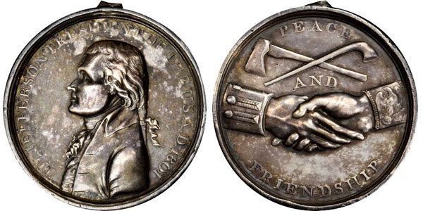 While the US mint prepared special silver medals for the expedition called “Indian Peace Medals” with a portrait of Jefferson and inscribed with a message of friendship and peace distributed by the soldiers in it…