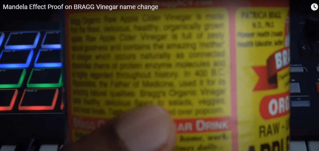 Two things I was already personally aware of related to the Mandela Effect are remembering Bragg’s Apple Cider Vinegar, but that somewhere along the way the ‘s went away, and it became Bragg…