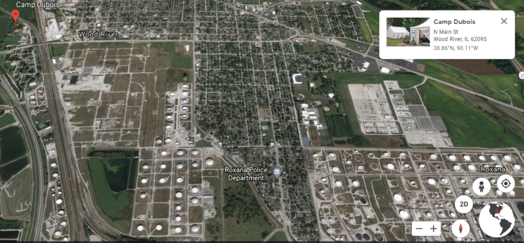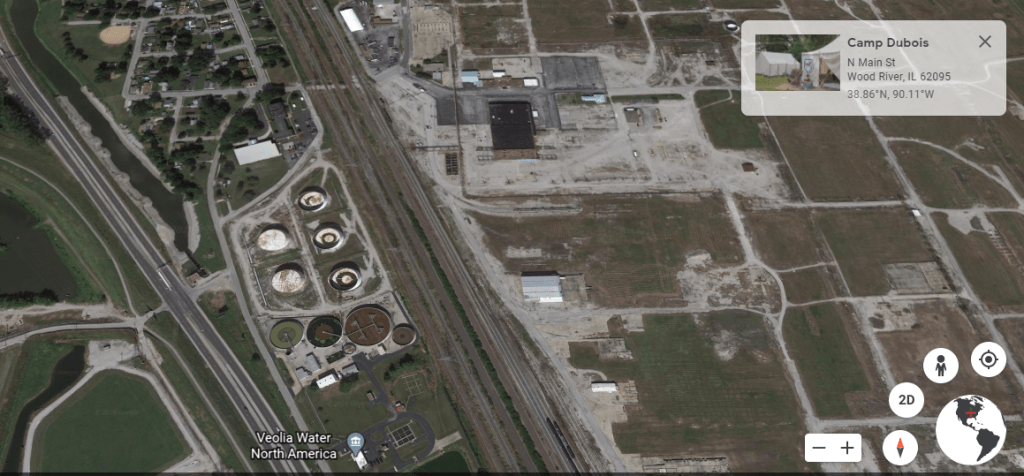 Also, just south of Camp Dubois in Wood River is a city government office and complex for Veolia Water North America, which primarily operates in the bottled water delivery business.