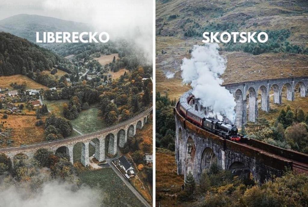 Next is showing a railroad bridge in Liberecko, a region in the northernmost part of the historical region of Bohemia in the Czech Republic, compared with a railroad bridge in Scotland on the right.
