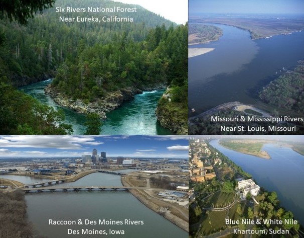 Here are some other examples of the similarity of river confluences like what is seen at Kaw Point:…On the top left is Six Rivers National Forest in Eureka, California, compared with the confluences of the Mississippi and Missouri Rivers near St. Louis on the top right; of the Raccoon and Des Moines Rivers near Des Moines, Iowa, on the bottom left; and of the Blue Nile and White Nile near Khartoum, in the African country of Sudan, on the bottom right.