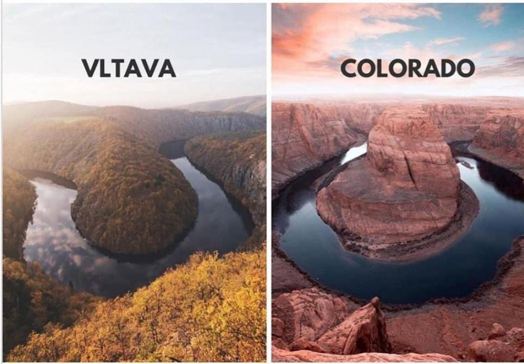 The first set is a comparison of a bend of the Vltava, the longest river in the Czech Republic, on the left, with the Horseshoe Bend of the Colorado River near Page, Arizona on the right.