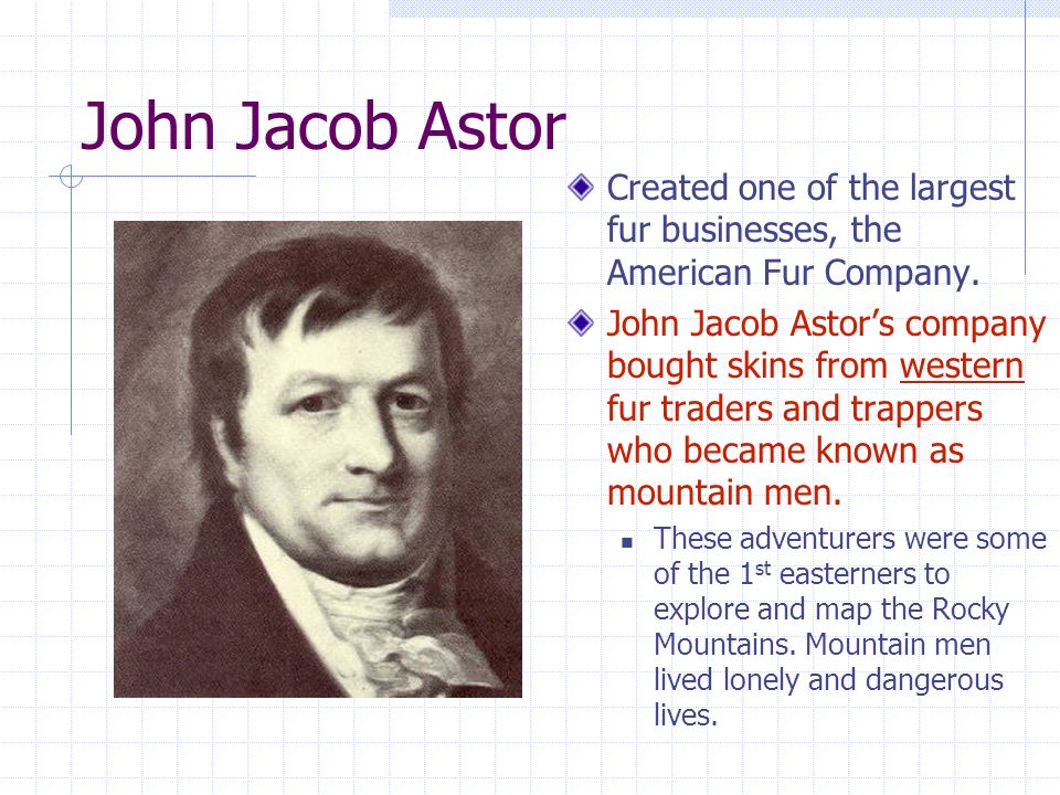 John Jacob Astor and the American Fur Company’s fur-trading fort at Fort Pierre, a stopping point of the expedition in Sioux country in present-day South Dakota, and the beginning of the wealth and influence of the Astor family…