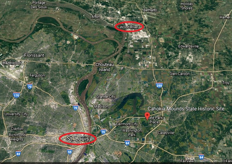 The location of Camp Dubois at Wood River is almost directly north of Cahokia, both on the Illinois side of the Mississippi River.