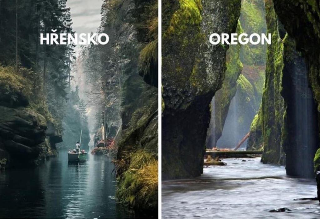 And lastly of this group, I want share the photo she sent comparing the view of a river in Hrensko, a village on the border with Germany at the confluence of the Kamenice and Elbe Rivers, and a portal to the Bohemian Switzerland National Park, compared with a view of a river in the State of Oregon.