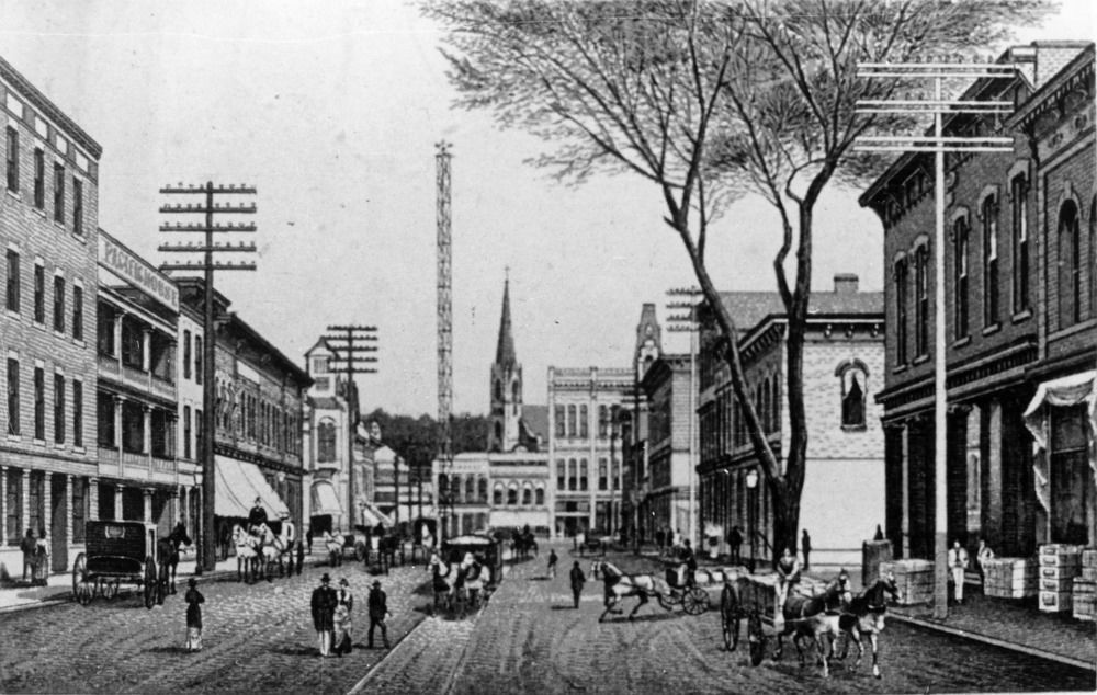 There is a 150-foot, or 46-meter, tall moontower that was used for city-lighting in this historic picture of Council Bluffs.
