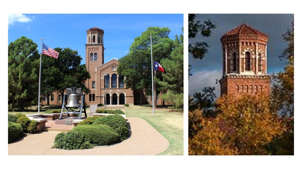 This is the Hardin Administrative Building on campus, said to have been completed around 1937, with a bell-tower shown on the right.