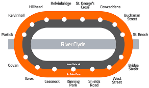 The fifteen stations of the subway are distributed over a 10-kilometer, or 6-mile, circuit of the West End and City Center of Glasgow, with eight stations to the north of the River Clyde, and seven to the south. There are two lines: an outer circle running clockwise, and an inner circle running counter-clockwise.