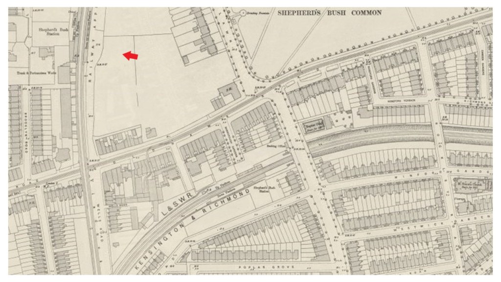 …and at one time bounded to the west by the rail-line which serviced the Shepherd’s Bush Station, again which was closed in 1916, and the tracks have been built over.
