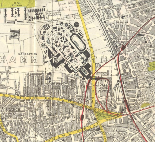 This is a detail of a map from 1912 called “Bacon’s Up-to-Date Map of London” showing the White City configuration, along with London Underground lines marked in red, and Tram lines marked in yellow.
