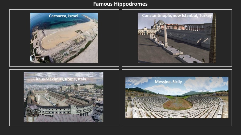 Famous Hippodromes from antiquity include one in Caesarea in Israel on the top left; Constantinople on the top right; the Circus Maximus in Rome on the bottom left; and one in Messina in Sicily.