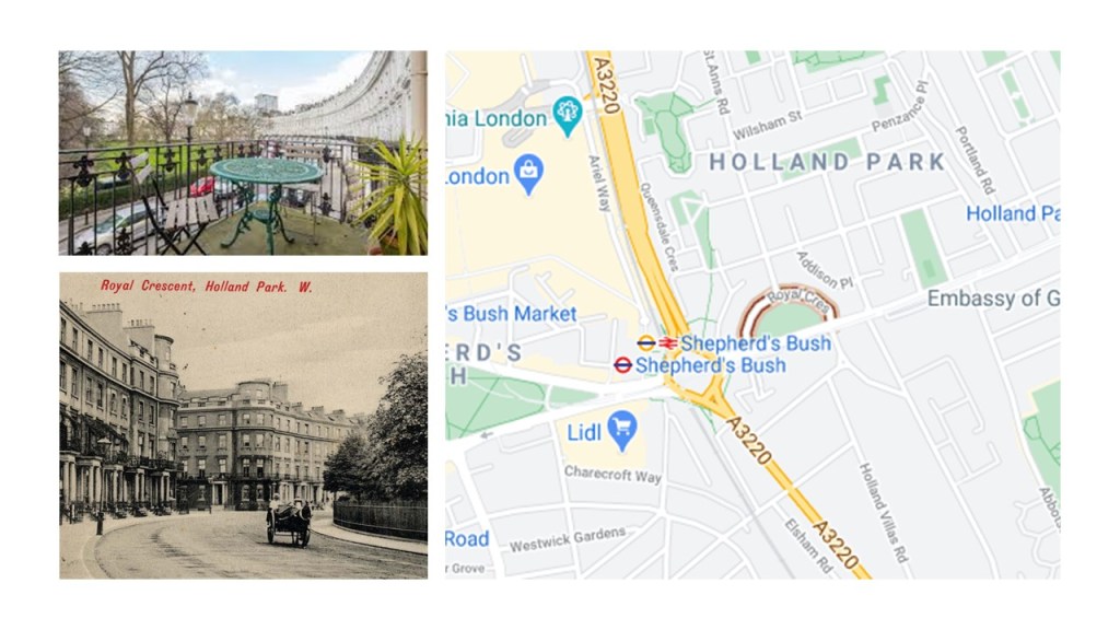 Neighboring Shepherd’s Bush, Holland Park is an affluent section of Kensington, known for its Royal Crescent, said to have been designed in 1839 by Robert Cantwell, and considered one of the most architecturally interesting 19th-century developments in Holland Park.