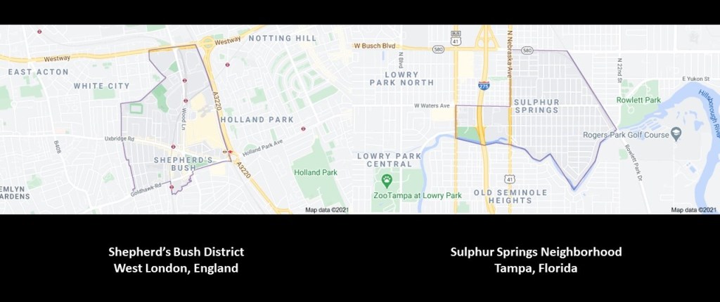 There is a similar relationship in the location of both of these places being close to a major international airport, with Shepherd’s Bush being 10-miles, or 16-kilometers in a straight-line, from London’s Heathrow Airport on the left; and on the right, the Sulphur Springs neighborhood of Tampa in a straight-line is 6-miles, or 10-kilometers, from Tampa International Airport.