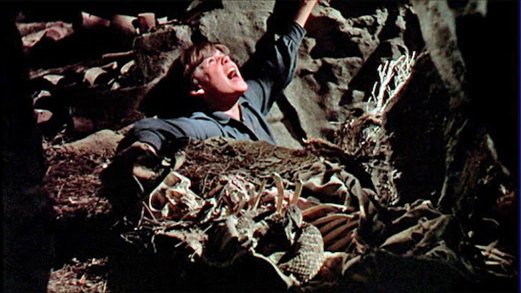 …and the other was the really suspenseful rattlesnake pit scene during which I got as far down in my seat as I could so as not to watch, and to this day I have never liked scary or suspenseful movies. I simply don’t watch them.