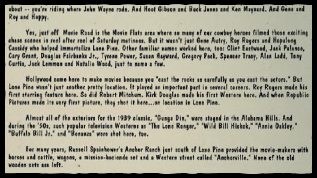 Let’s return to Lone Pine, California for a moment, which became a home away from Hollywood for many-a-star-and-film-shoot.