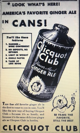 “Cliquot Club” was a popular ginger ale that was “Canada Dry’s” main rival, until the Cliquot Club Company was bought by Cott Beverage Company in 1965 and dissolved in 1980.