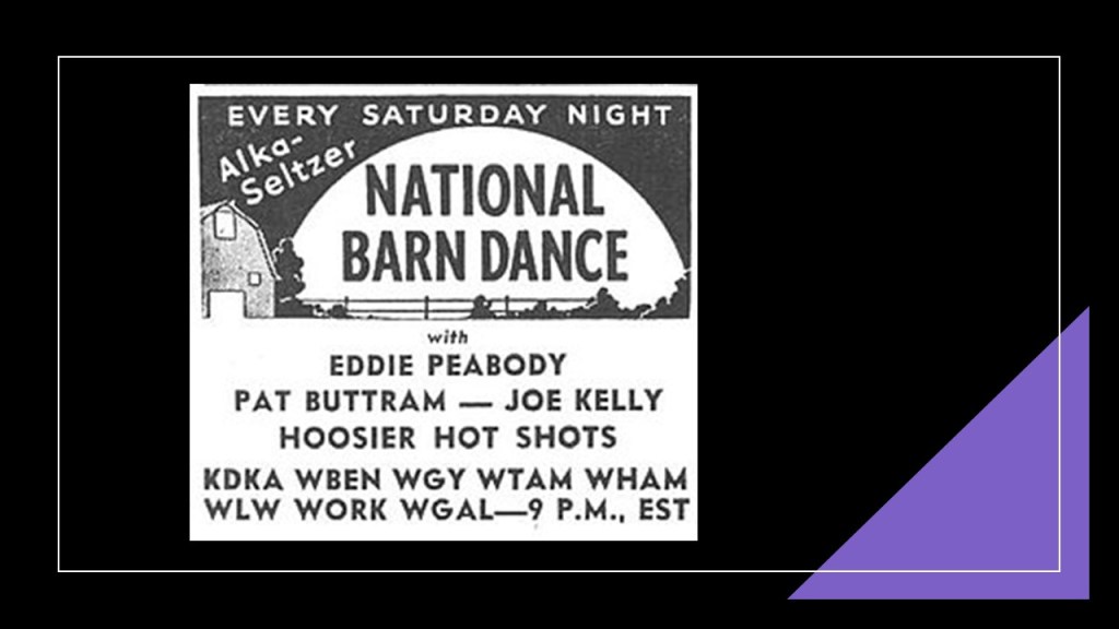 The National Barn Dance radio program had such sponsors as “Alka-Seltzer” -remember “plop-plop-fizz-fizz-oh what a relief it is…”