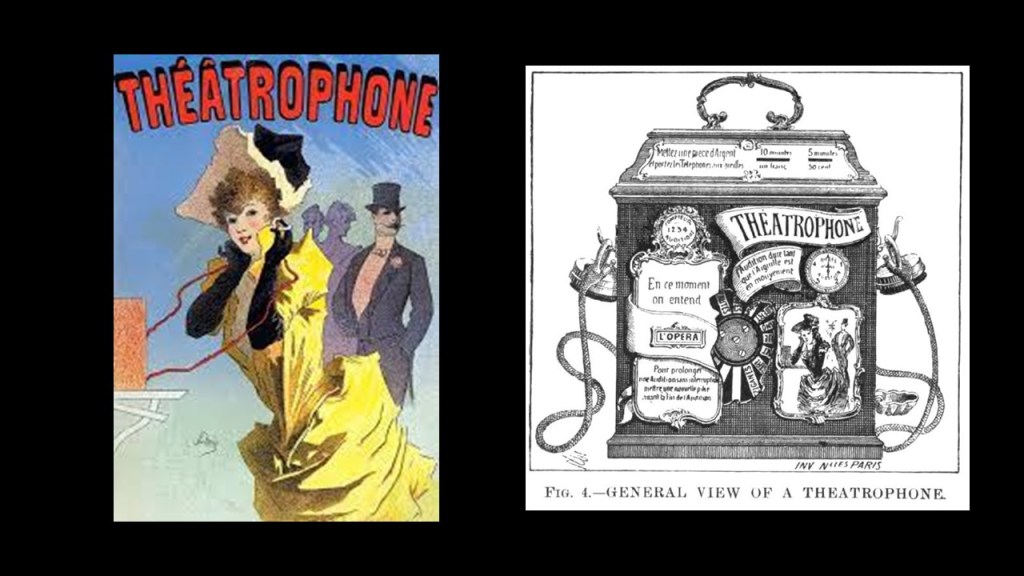 The precedent before the radio for broadcasts of live drama, comedy, music and news were called “Theatrophones” which were commercially introduced in Paris in 1890 and available through the early 1930’s.
