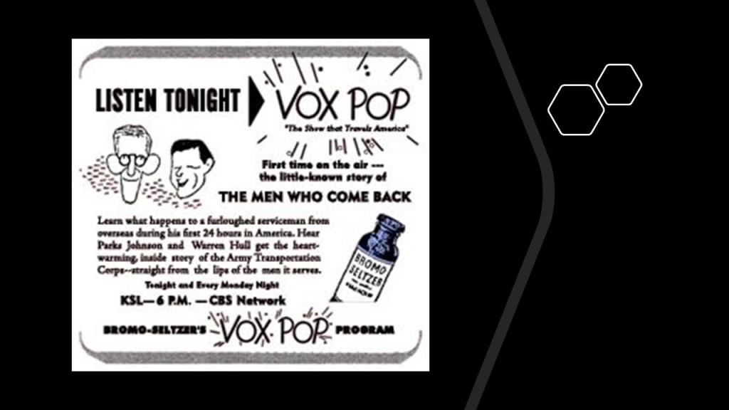 A major advertising sponsor of the Vox Pop radio program was Bromo-Seltzer, an early brand of antacid that was used to relieve the pain of heartburn, upset stomach, indigestion, and had a sedative effect that helped relieve hangovers.