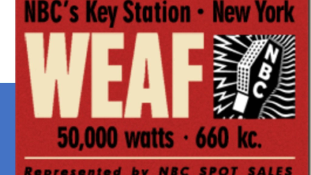 WEAF began selling time for “Toll Broadcasting,” which allowed anyone to use a licensed AT & T radio station to broadcast any message of their choosing for a fee based on time-of-day and duration, and the idea of selling blocks of times to advertisers to fund broadcasts came from here.