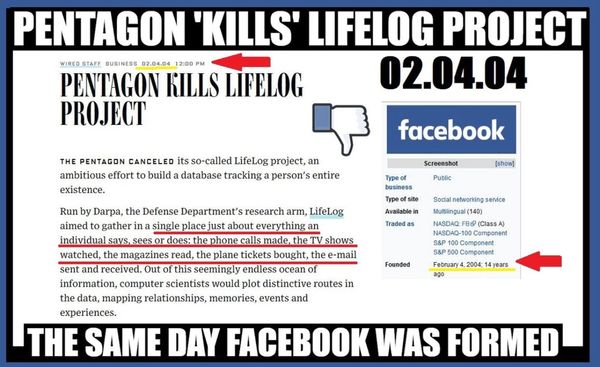 It is interesting to note that Lifelog, a project of the Defense Advanced Research Projects Agency (DARPA), was cancelled on the same day of February 4th of 2004 that Facebook was founded.
